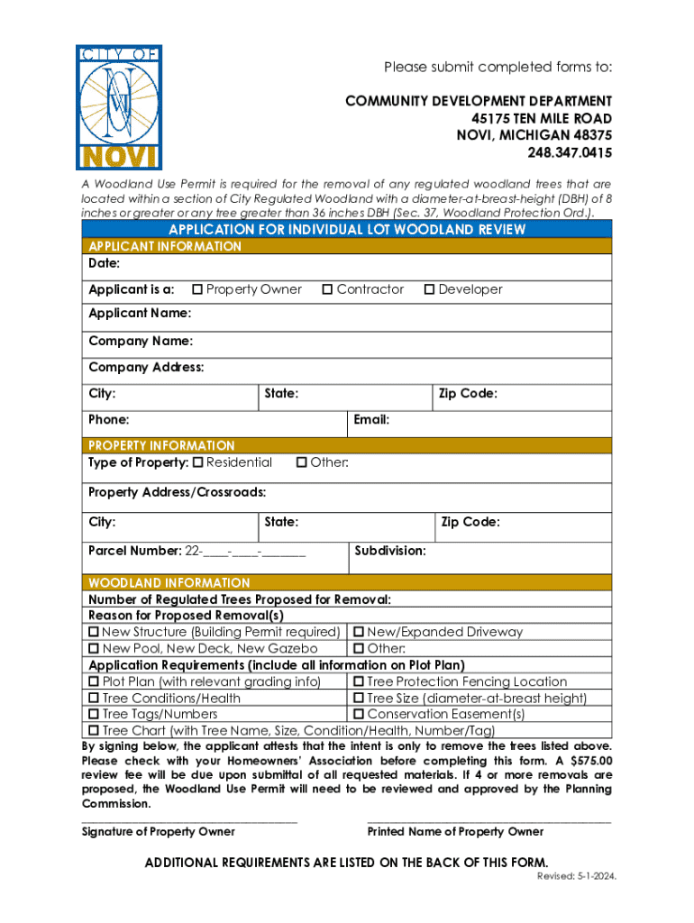 This application is required for the removal of any regulated woodland trees with a diameter-at-breast-height (DBH) of 8 inches or greater or any tree greater than 36 inches DBH within a city-regulated
