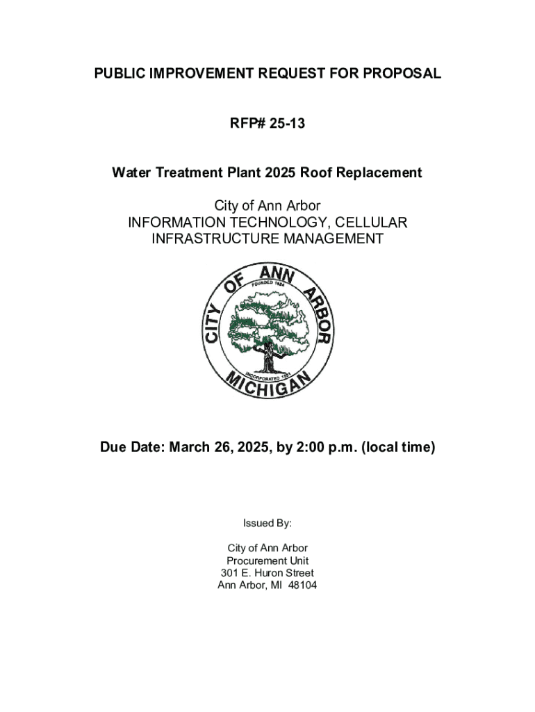 This document outlines the Request for Proposal (RFP) for construction services for the replacement of the roof at the Water Treatment Plant in the City of Ann Arbor. It details the scope of work,