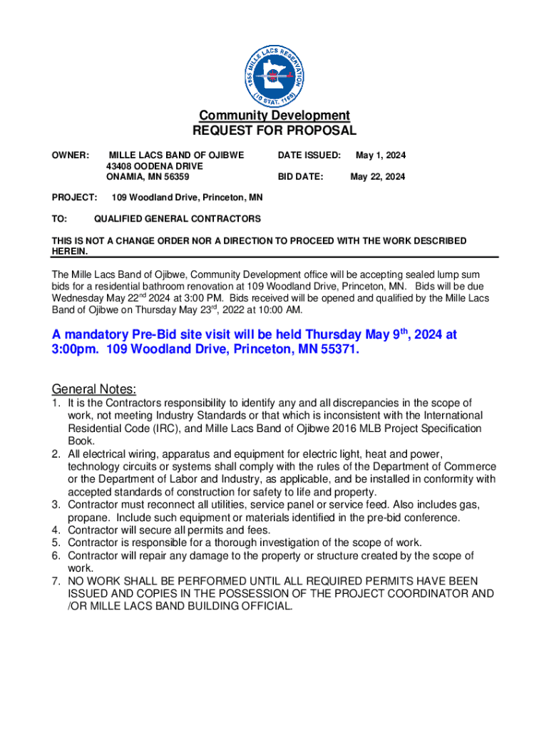 Este documento solicita propuestas para la renovación de un baño residencial en 109 Woodland Drive, Princeton, MN. Se aceptan ofertas selladas y hay requisitos específicos que los contratistas