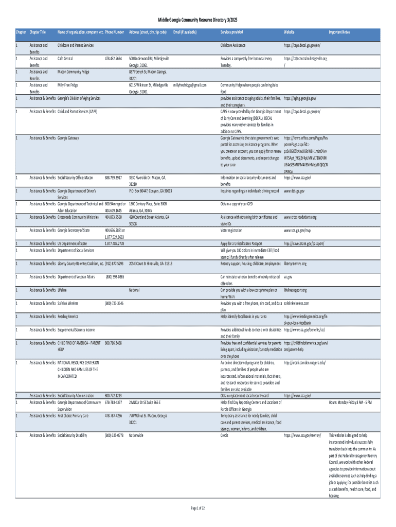 Middle Georgia Community Resource Directory 3/2025 ChapterChapter TitleName of organization, company, etc. Phone Number1Childcare and Parent Services1Assistance and Benefits Assistance and Benefits