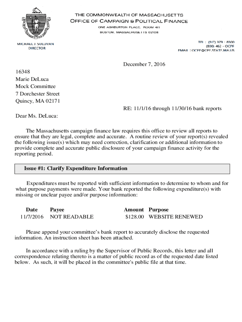 December 7, 2016 16348 Marie DeLuca Mock Committee 7 Dorchester Street Quincy, MA 02171 RE: 11/1/16 through 11/30/16 bank reports Dear Ms. DeLuca: The Massachusetts campaign finance law requires this