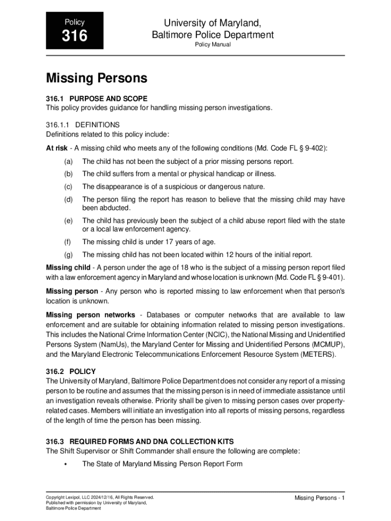 This policy provides guidance for handling missing person investigations, including definitions, procedures for reporting, and investigation protocols. It emphasizes the priority of missing person