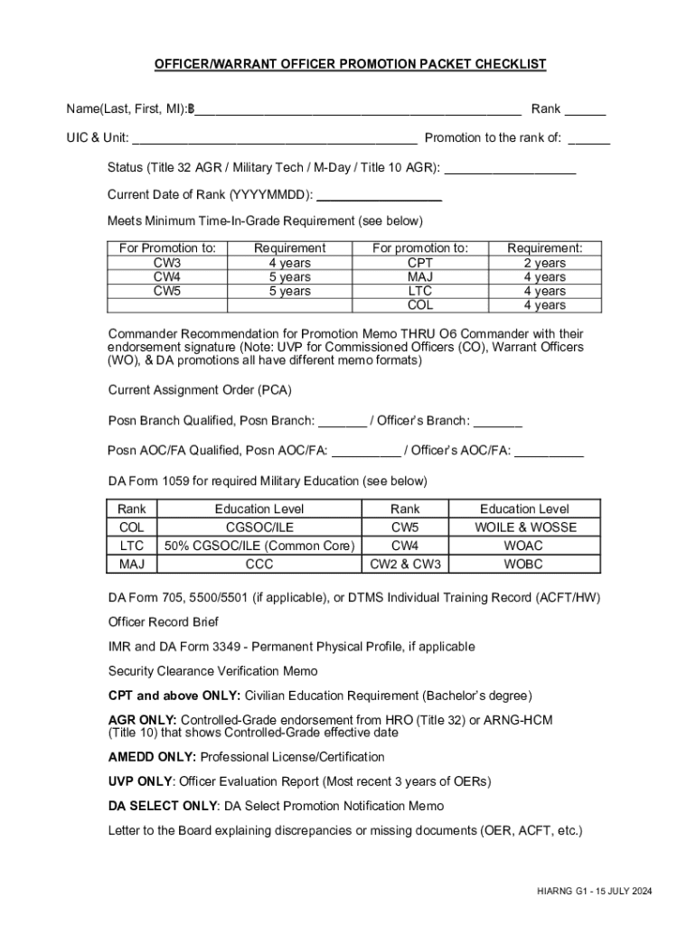 This checklist outlines the requirements and documents necessary for officers and warrant officers to be considered for promotion within the military ranks, including minimum time-in-grade requirements,