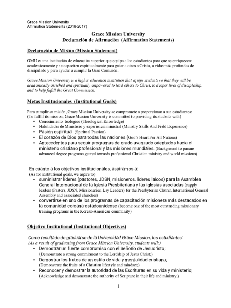 Este documento contiene las declaraciones de misión, metas institucionales, objetivos institucionales y la filosofía educativa de la Universidad Grace Mission, así como un código de conducta y