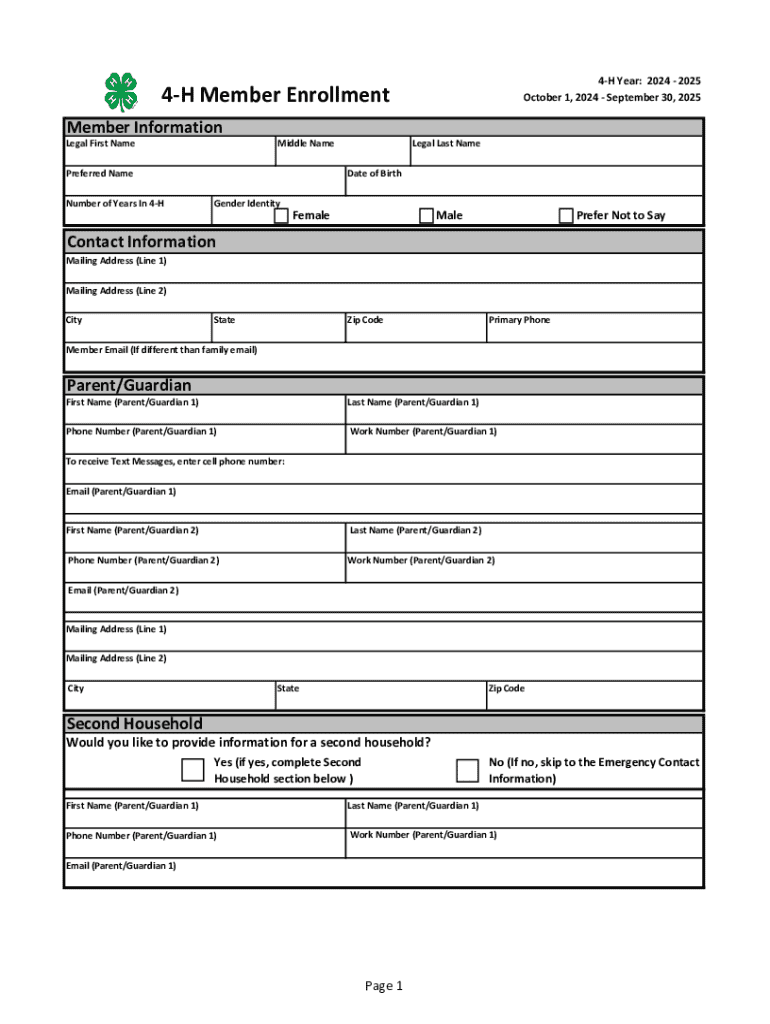 This document serves as an enrollment form for 4-H members for the year 2024 - 2025, including sections for member information, contact details, demographics, school information, club participation,