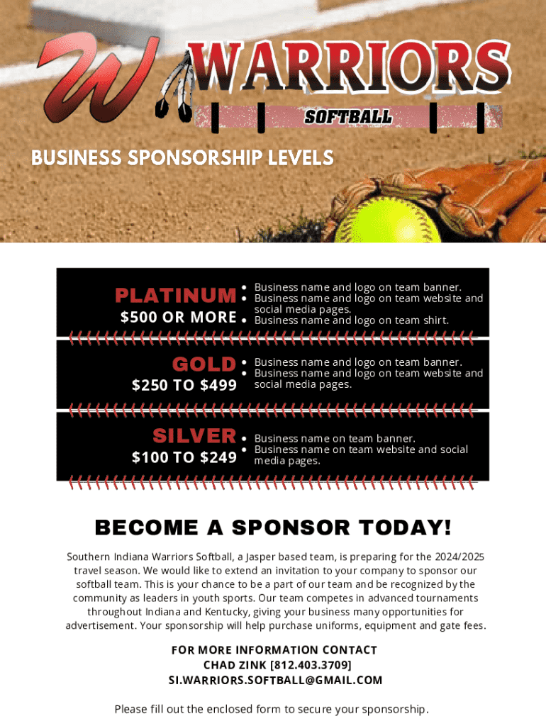 This form is to secure sponsorship for the Southern Indiana Warriors Softball team, detailing various sponsorship levels and benefits for businesses.