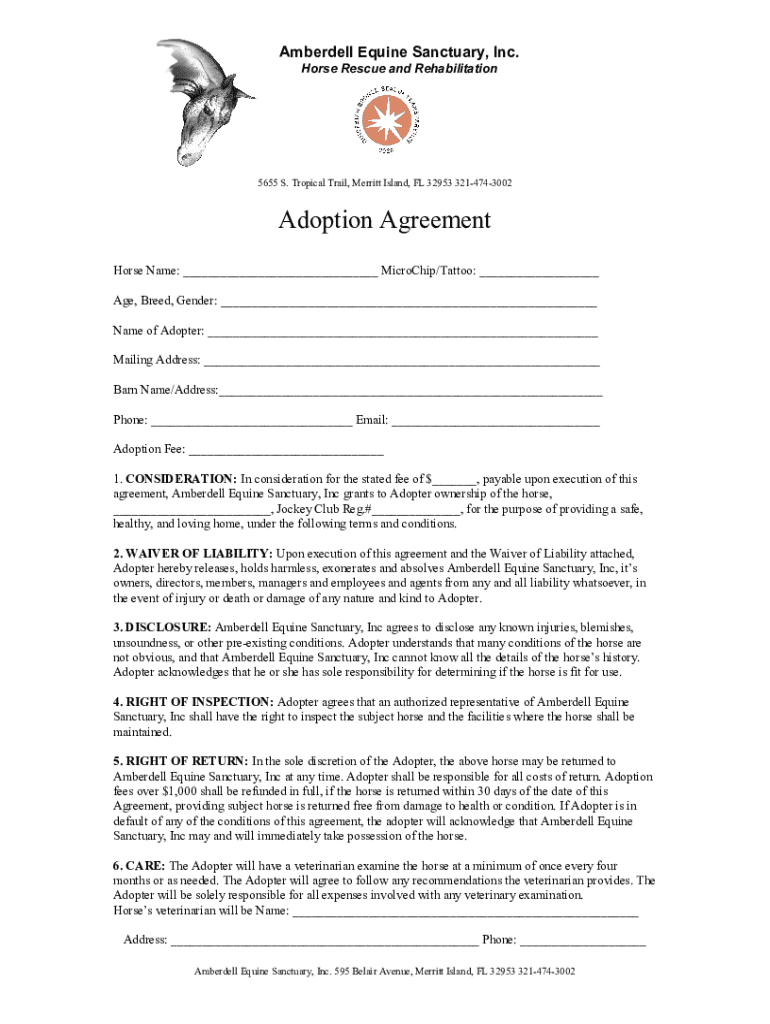 This document outlines the terms and conditions for the adoption of a horse from Amberdell Equine Sanctuary, Inc., including the responsibilities of the adopter and the rights of the sanctuary regarding