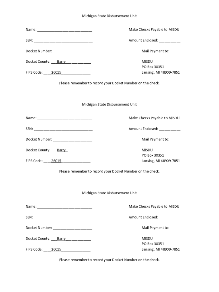 Michigan State Disbursement Unit Name: ___Make Checks Payable to MISDUSSN: ___Amount Enclosed: ___Docket Number: ___Mail Payment to:Docket County: ___Barry___MISDU PO Box 30351 Lansing, MI 489097851FIPS