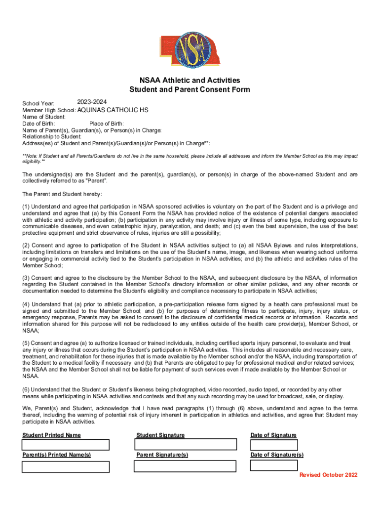 Get the free Nsaa Athletic and Activities Student and Parent Consent Form