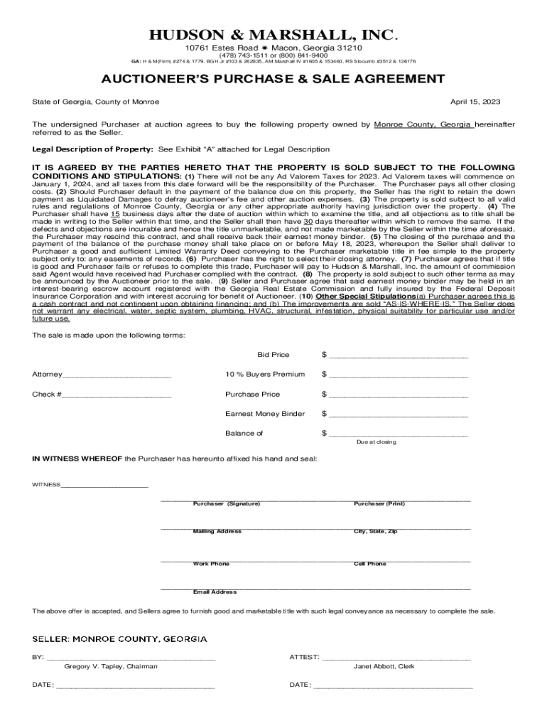 This document is an agreement for the purchase of property at auction in Monroe County, Georgia. It outlines the terms and conditions of the sale, including responsibilities regarding taxes, closing