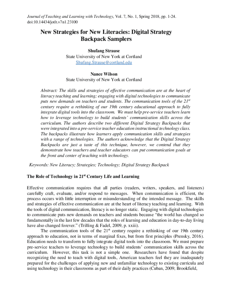 Journal of Teaching and Learning with Technology, Vol. 7, No. 1, Spring 2018, pp. 124. doi:10.14434/jotlt.v7n1.23100New Strategies for New Literacies: Digital Strategy Backpack Samplers Shufang Strause