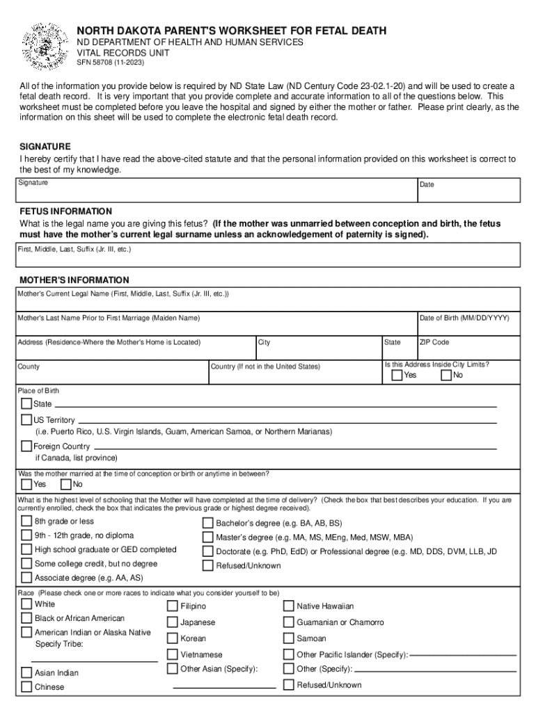 This worksheet is required by ND State Law to provide information for creating a fetal death record. It must be completed accurately and signed by either the mother or father before leaving the hospital.