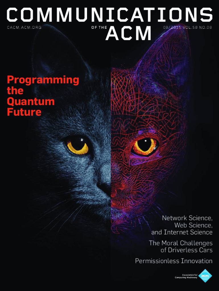 COMMUNICATIONS ACM CACM.ACM.ORGOF THE08/2015 VOL.58 NO.08Programming the Quantum FutureNetwork Science, Web Science, and Internet Science The Moral Challenges of Driverless Cars Permissionless Innovation