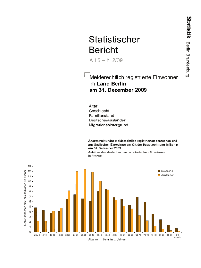 StatistikA I 5 hj 2/09 Melderechtlich registrierte Einwohner im Land Berlin am 31. Dezember 2009 Alter Geschlecht Familienstand Deutsche/Auslnder MigrationshintergrundAltersstruktur der melderechtlich
