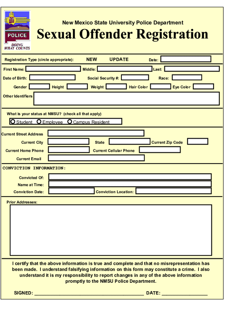 This form is used for registering individuals with the New Mexico State University Police Department, including personal and conviction information.
