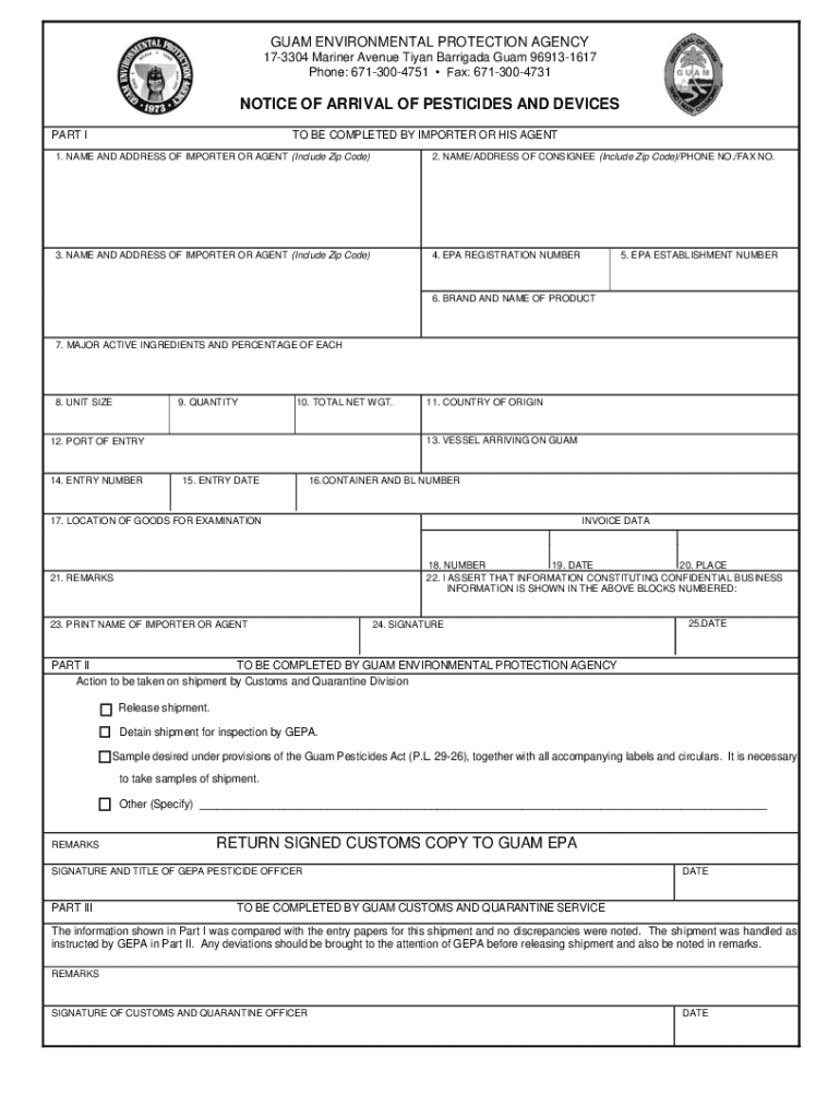Get the free Notice of Arrival of Pesticides and Devices - epa guam