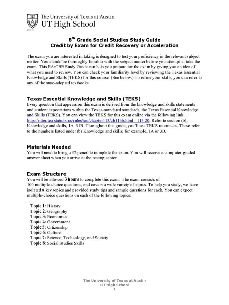 1015158th Grade Social Studies Study Guide Credit by Exam for Credit Recovery or AccelerationThe exam you are interested in taking is designed to test your proficiency in the relevant subject matter.