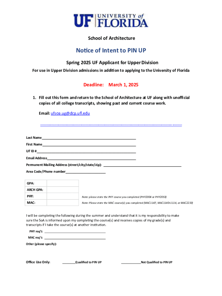This form must be filled out and returned to the School of Architecture at UF along with unofficial copies of all college transcripts, showing past and current coursework. It is required for Upper