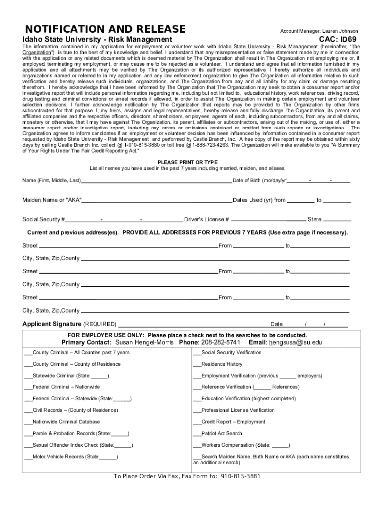 This document serves as a notification and release form for applicants seeking employment or volunteer opportunities at Idaho State University - Risk Management. It includes authorization for information