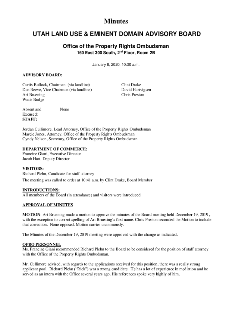 Minutes from the meeting of the Utah Land Use & Eminent Domain Advisory Board held on January 8, 2020, covering various agenda items including personnel recommendations, land use training applications,