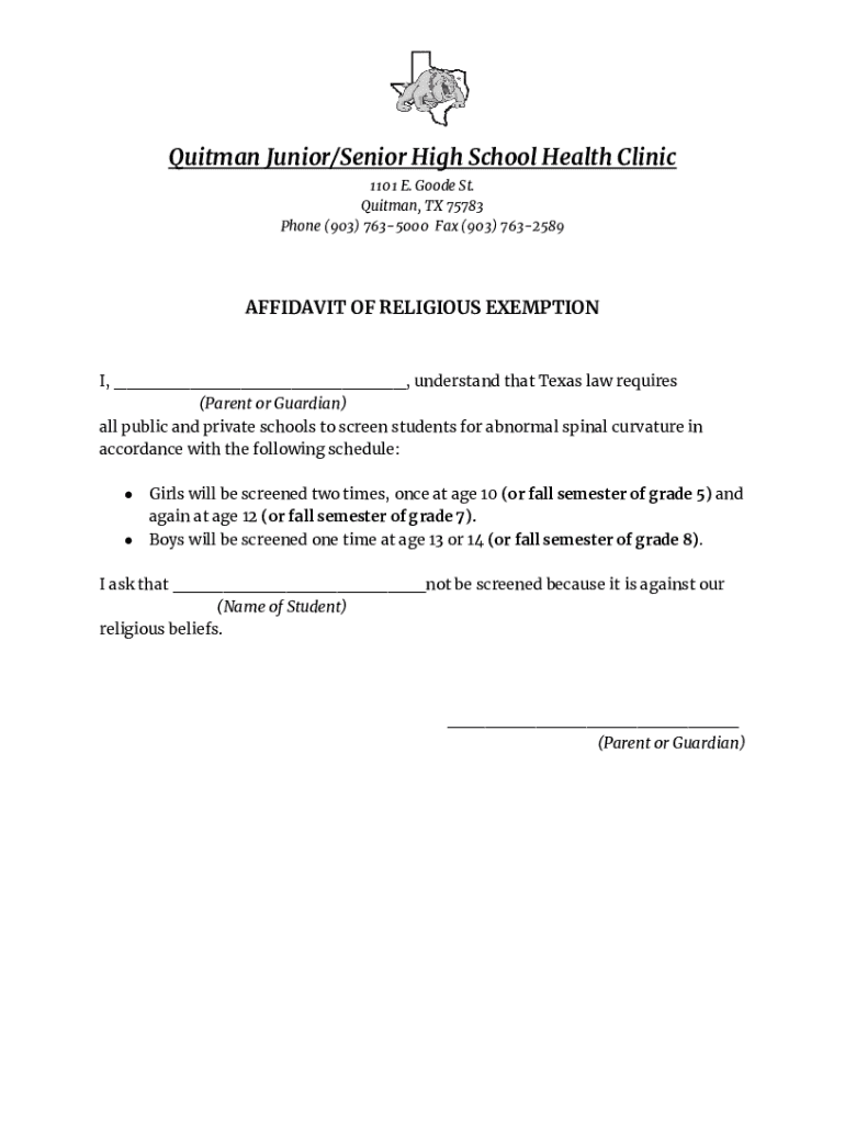 This document serves as an affidavit expressing a parent\'s or guardian\'s request for a religious exemption from the required spinal curvature screening for their child in accordance with Texas law.
