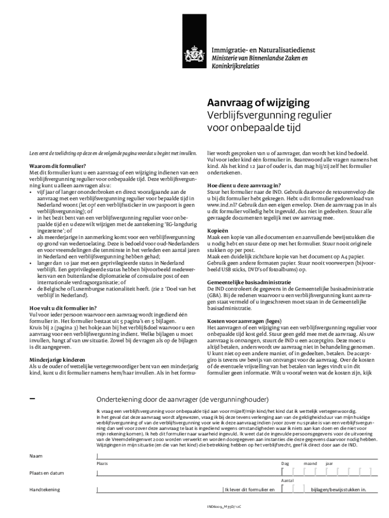 Dit formulier is bedoeld voor het indienen van een aanvraag of wijziging van een verblijfsvergunning regulier voor onbepaalde tijd in Nederland. Het biedt de voorwaarden en instructies voor de aanvrager,