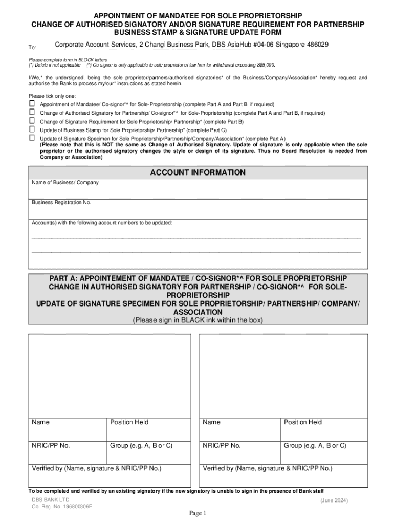 This form is used to appoint a mandatee, change authorized signatories, update signatures, and update business stamps for sole proprietorships and partnerships. It includes sections for account information,