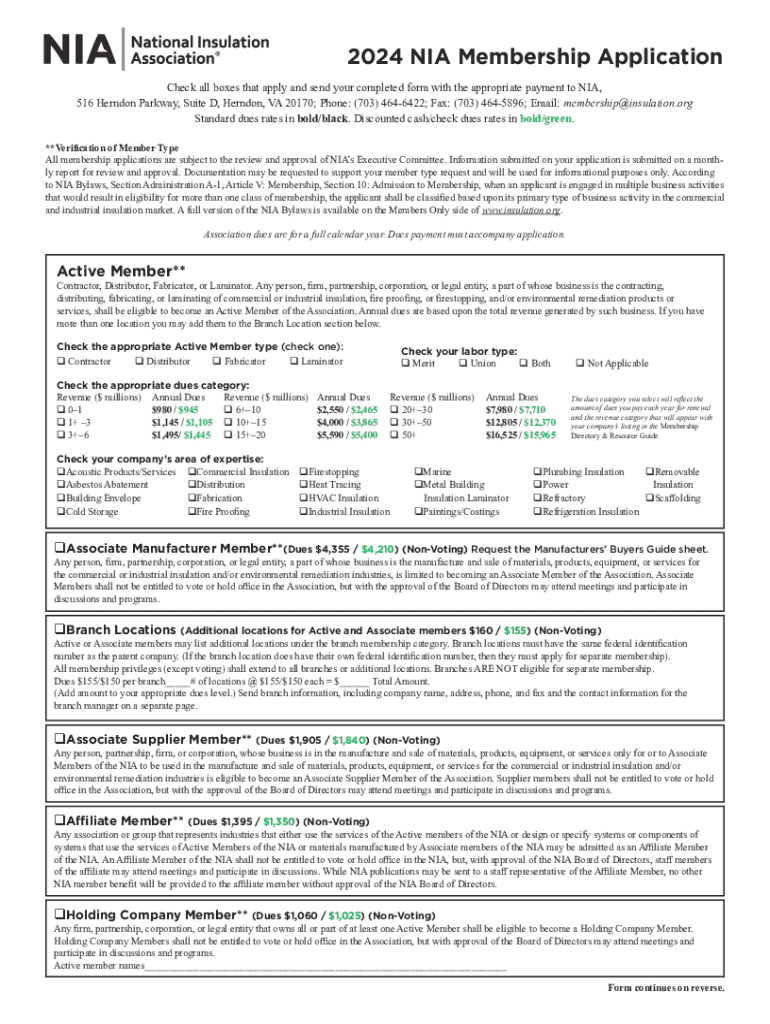 This document is an application for membership in the National Insulation Association (NIA). It outlines various membership categories, dues rates based on revenue, and the eligibility requirements