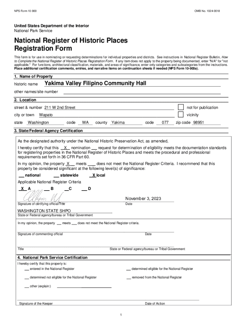 NPS Form 10-900 is the National Park Service's application form for the nomination of properties to the National Register of Historic Places.