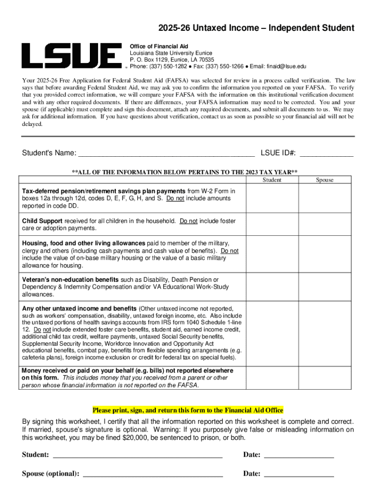 This document is used by independent students to report untaxed income and benefits for the 2025-26 academic year as part of the verification process for Federal Student Aid at Louisiana State University