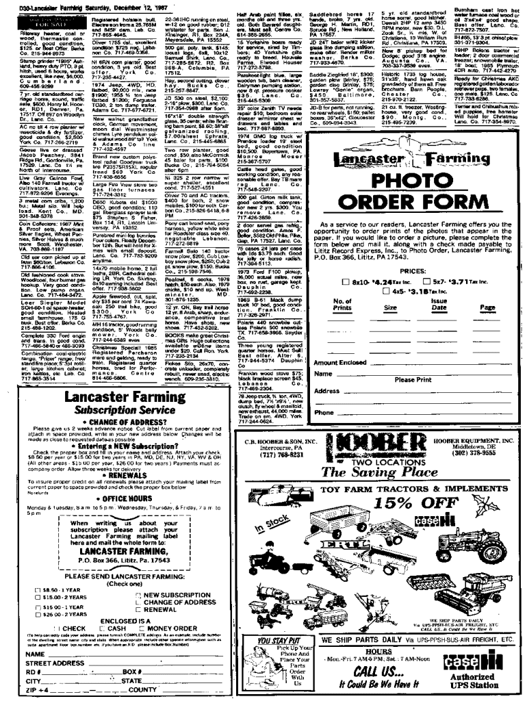 D3Olancast*r 1.V !I i1 ,X,Saturday, Dacwhbw 12,1987iFarrtilhflRegistered holstein bull, Electro son from a 25,765 MM\'.U\'llOR SAIRiteway heater, coal or wood, thermastic controlled, good condition,