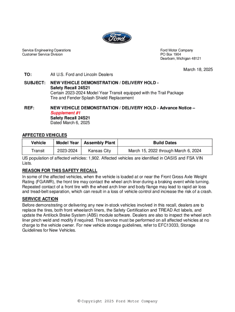 Service Engineering Operations Customer Service DivisionFord Motor Company PO Box 1904 Dearborn, Michigan 48121March 18, 2025 TO:All U.S. Ford and Lincoln DealersSUBJECT:NEW VEHICLE DEMONSTRATION