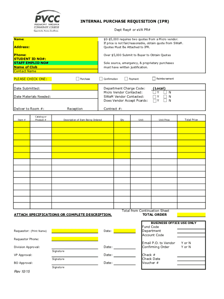 Fill out the internal purchase requisition form with the necessary details such as item description, quantity, and purpose.