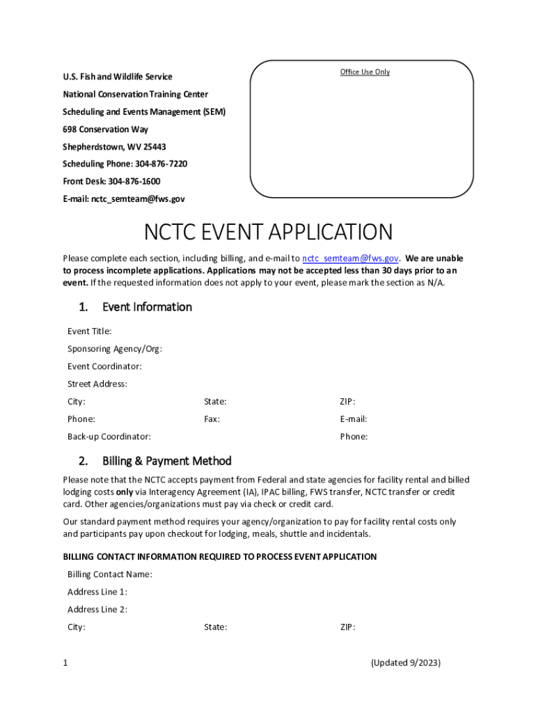 This document is a comprehensive application form for scheduling events at the National Conservation Training Center (NCTC), collecting necessary event details, billing information, and policies regarding