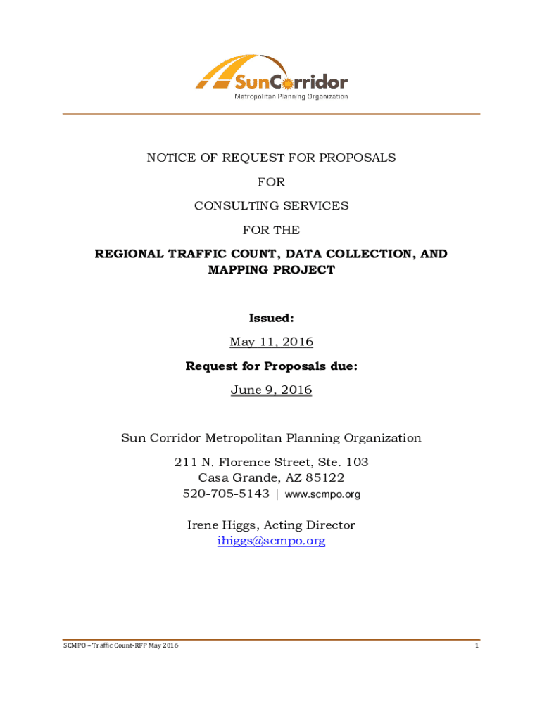 The Sun Corridor Metropolitan Planning Organization invites qualified persons/firms to submit Proposals for consulting services to provide regional traffic counts on functionally classified roads