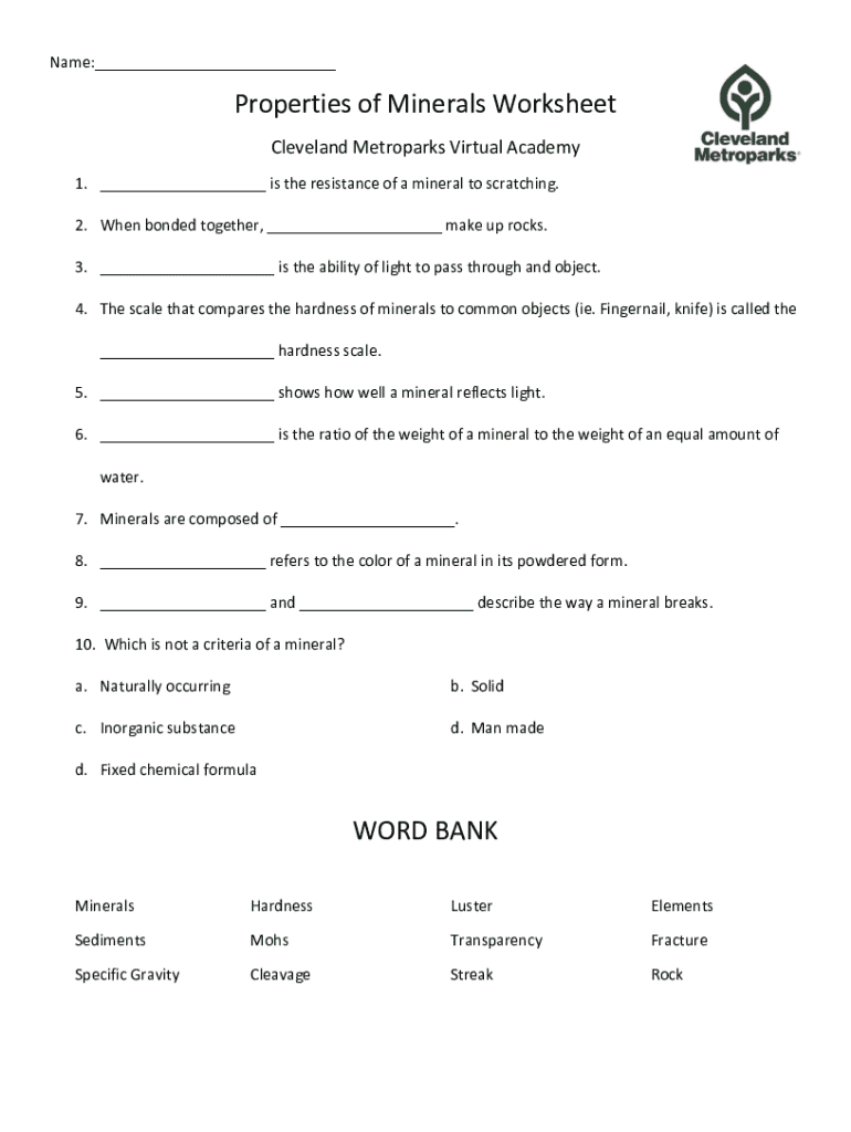 A worksheet for exploring the properties of minerals, including their hardness, luster, and other characteristics.