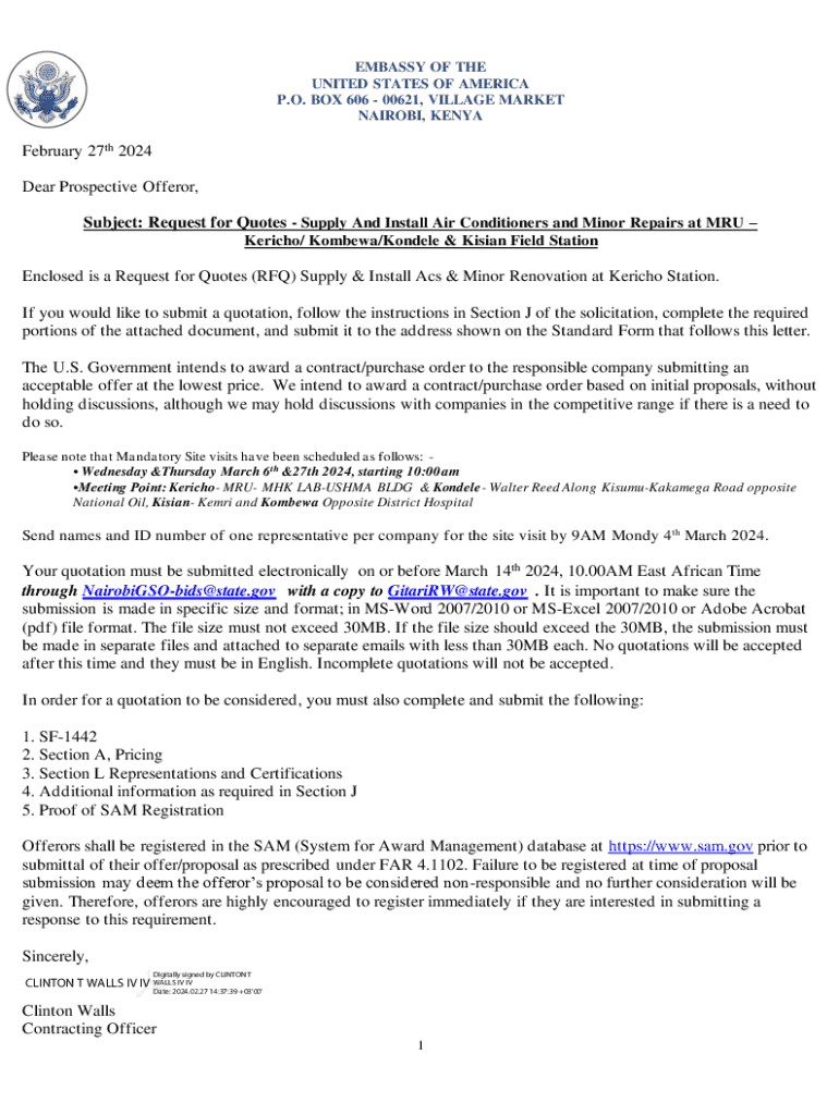 EMBASSY OF THE UNITED STATES OF AMERICA P.O. BOX 606 00621, VILLAGE MARKET NAIROBI, KENYAFebruary 27th 2024 Dear Prospective Offeror, Subject: Request for Quotes Supply And Install Air Conditioners