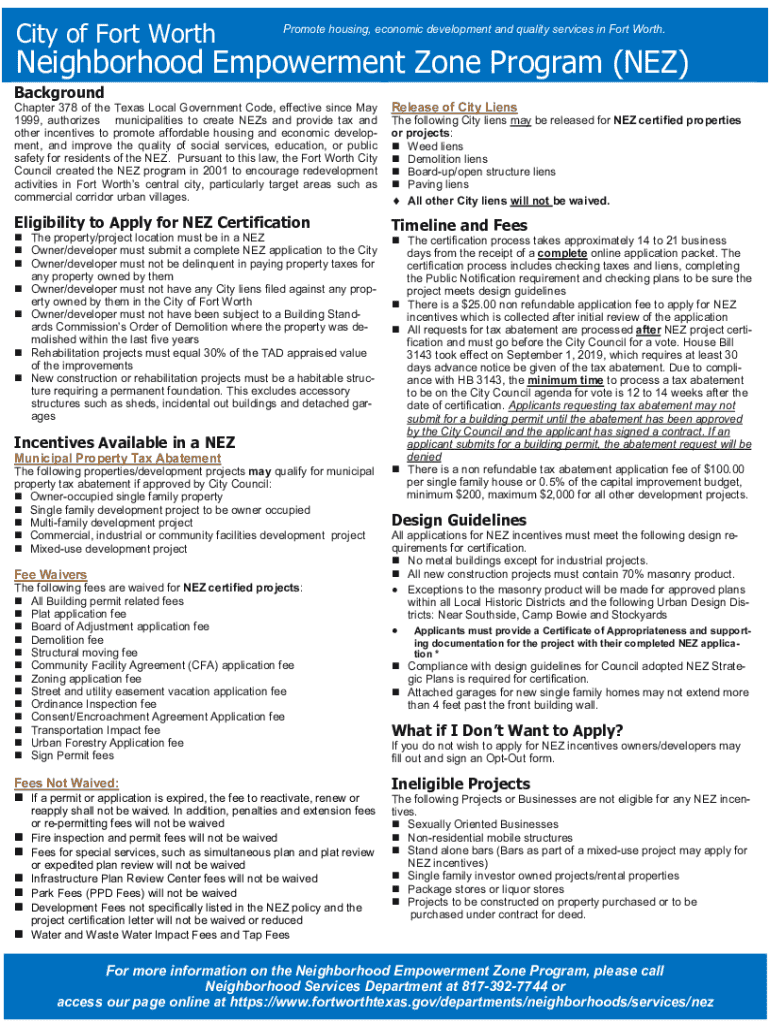 The NEZ Application for Incentives is designed for property owners and developers in Fort Worth to apply for tax abatements and various fee waivers under the Neighborhood Empowerment Zone Program,