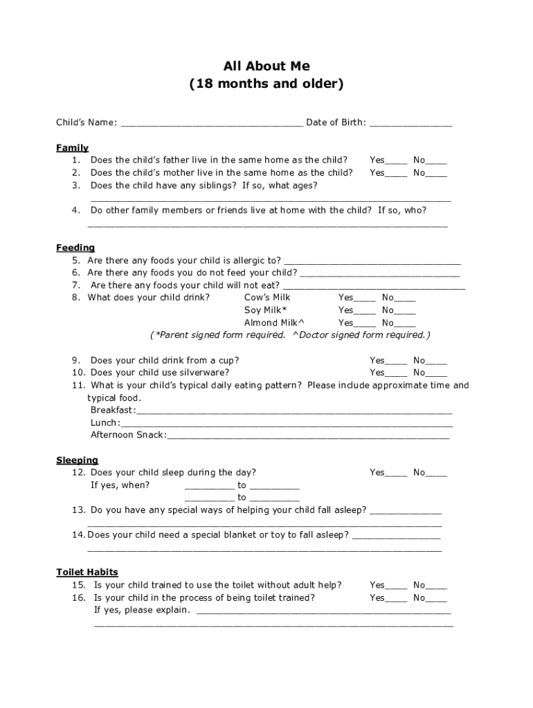 This document is a questionnaire designed to gather information about a child\'s family background, feeding habits, sleeping patterns, toilet training, developmental history, and other important aspects