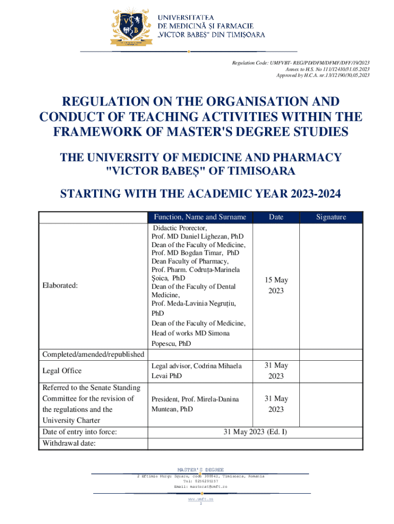 This regulation outlines the organization and conduct of master\'s degree studies at the University of Medicine and Pharmacy \'Victor Babeș\' of Timișoara, effective from the academic year 2023-2024.