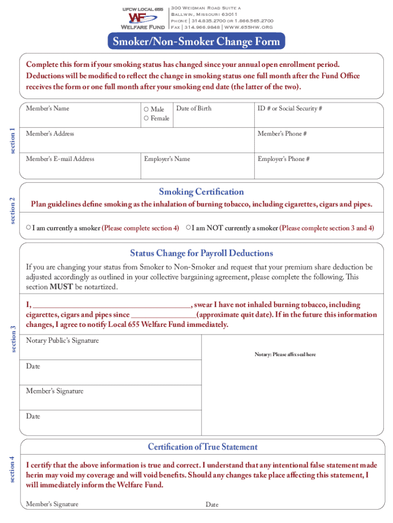 Complete this form if your smoking status has changed since your annual open enrollment period. Deductions will be modified to reflect the change in smoking status one full month after the Fund Office