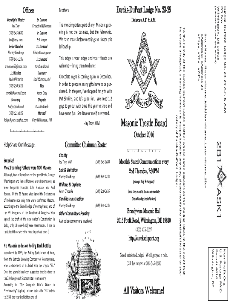 Delaware A.F. & A.M.This lodge is your lodge, and your friends are welcome bring them to dinner. Chocolate night is coming again in December. In order to prepare, many gifts have to be purchased.