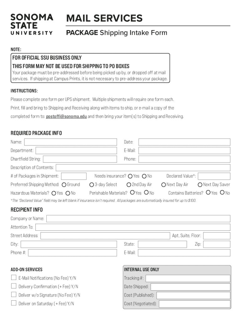 This form is used for shipping packages through official SSU business. It details instructions for package preparation and submission, as well as required information such as recipient details and