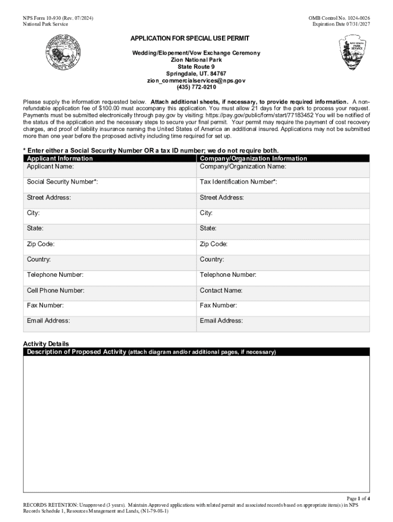 This form is utilized to apply for a special use permit for wedding, elopement, or vow exchange ceremonies at Zion National Park. It outlines the necessary details and requirements for the application