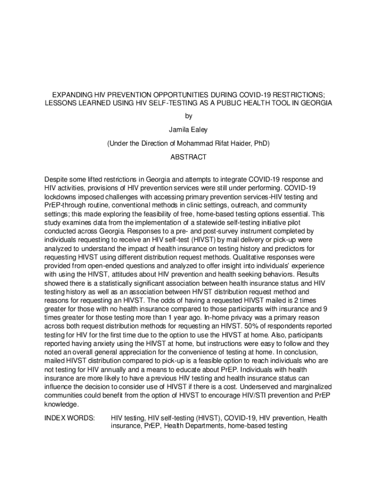 This dissertation examines the impact of HIV self-testing (HIVST) as a public health tool in Georgia, particularly during the COVID-19 pandemic. It analyzes the feasibility and effectiveness of home-based