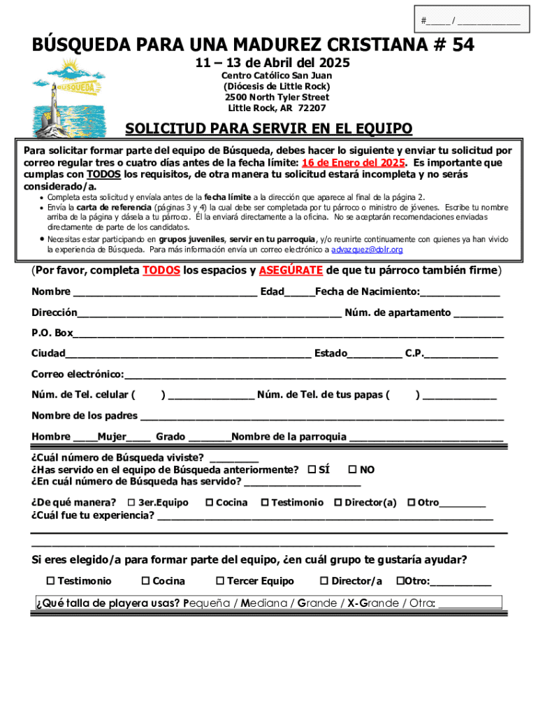 Solicitud para unirse al equipo de Búsqueda, un retiro espiritual para adolescentes que promueve el crecimiento en la fe cristiana y el liderazgo juvenil. Incluye requisitos, fechas importantes y