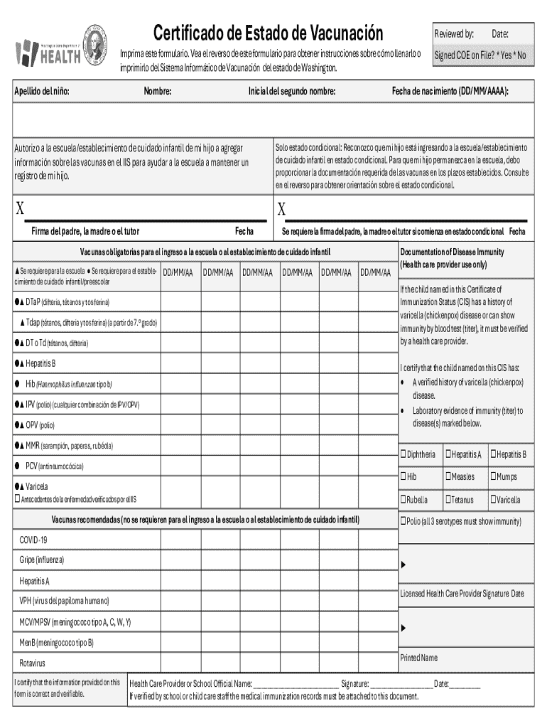 Este formulario se utiliza para documentar el estado de vacunación de un niño que ingresa a la escuela o establecimiento de cuidado infantil en el estado de Washington. Incluye instrucciones para