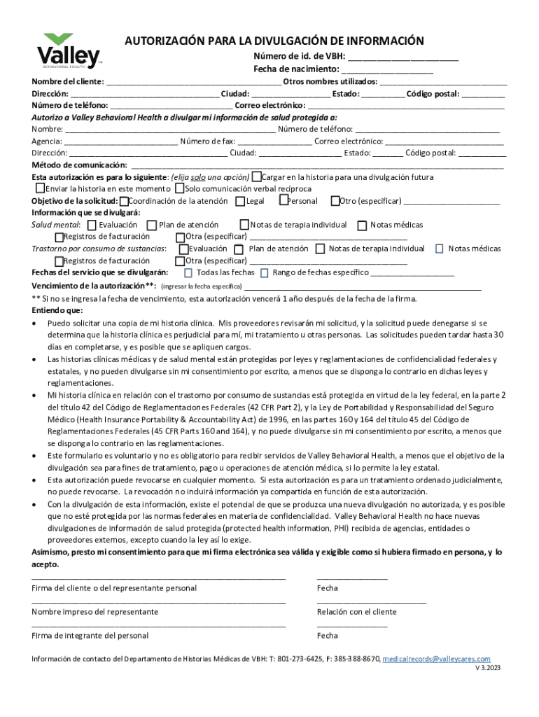 Este formulario permite a los clientes autorizar a Valley Behavioral Health a divulgar su información de salud protegida a terceros. Incluye información sobre datos personales, sus objetivos de