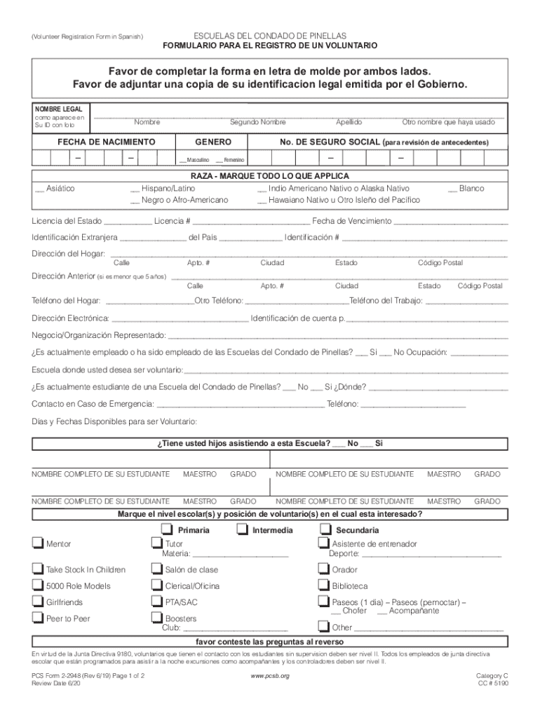 Este formulario es utilizado para registrar a voluntarios en las Escuelas del Condado de Pinellas. Incluye información personal, verificación de antecedentes, y requisitos de identificación.