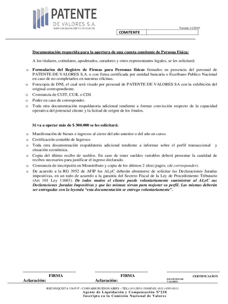 Versin 11/2019COMITENTEDocumentacin requerida para la apertura de una cuenta comitente de Persona Fsica: A los titulares, cotitulares, apoderados, curadores y otros representantes legales, se les